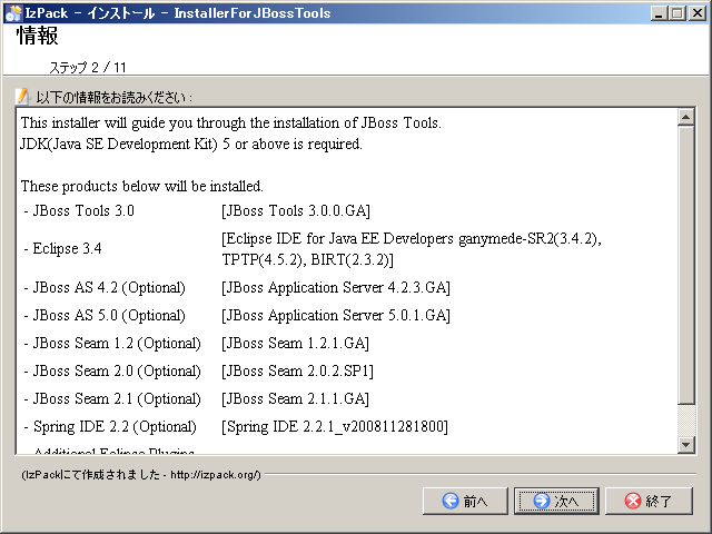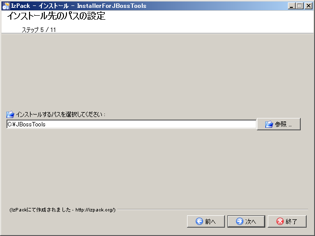 Eclipseを含むJBoss Toolをインストールするパスを入力して、[次へ]ボタンをクリックする。
