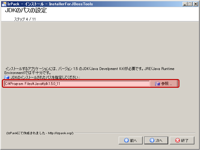 JDKがインストールされたパスを入力して、[次へ]ボタンをクリックする。