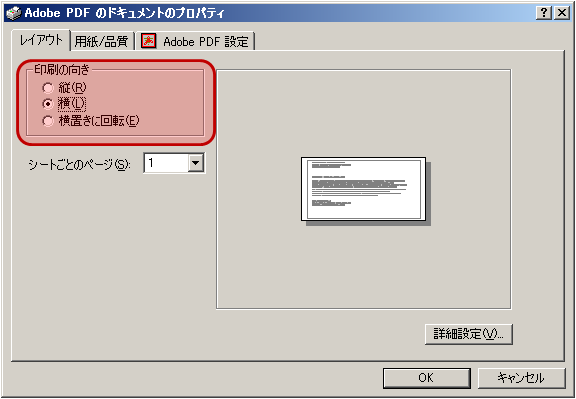 印刷ジョブのプロパティを変更するためのダイアログにページの印刷方向に初期値を設定する方法を以下に示します。 ダイアログで指定した印刷方向でページが印刷されます。