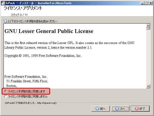 [ライセンス利用許諾に同意します]を選択して、[次へ]ボタンをクリックする。